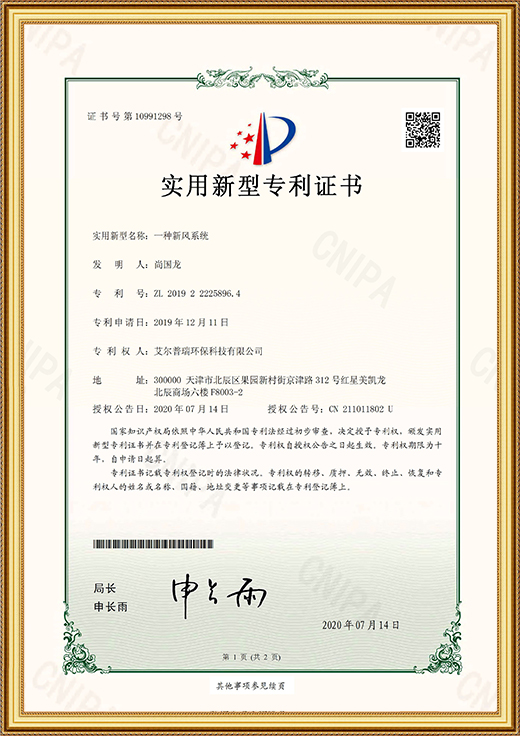 • 實用新型專利證書(一種新風系統)